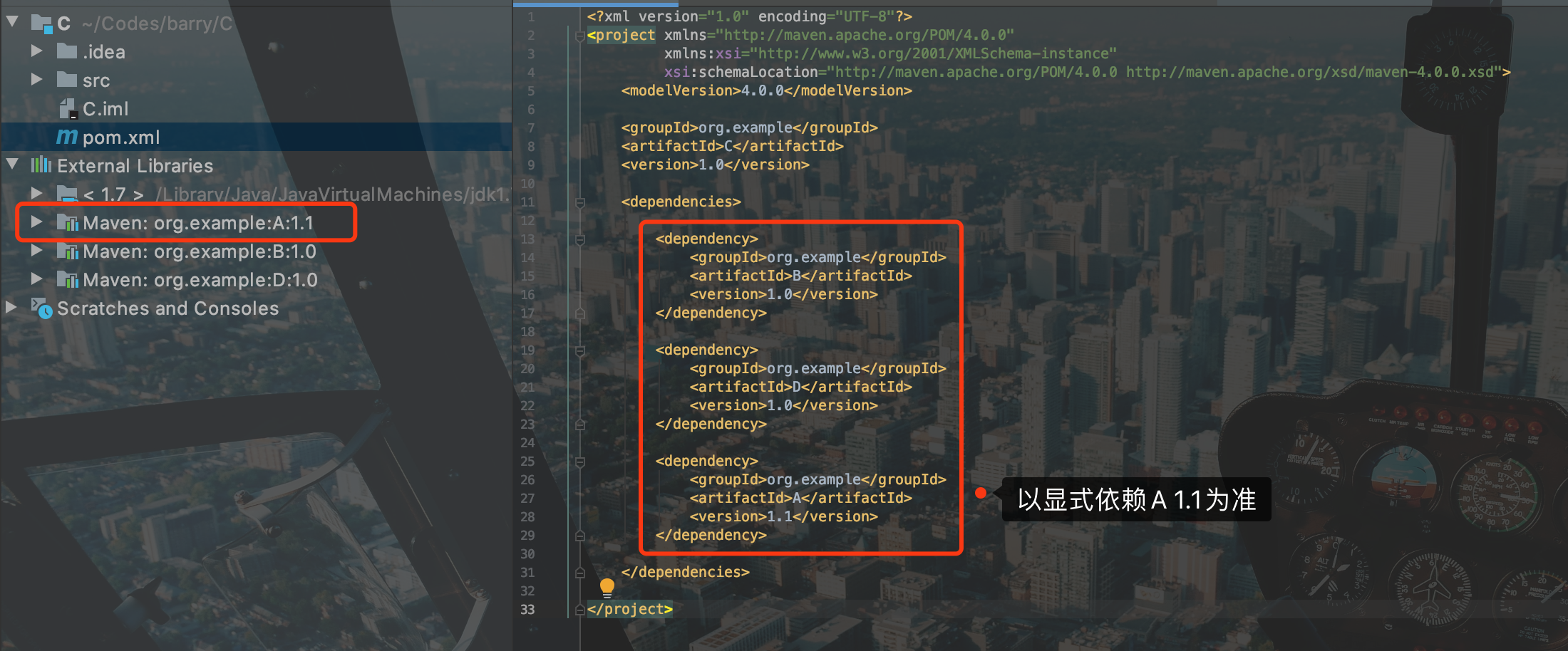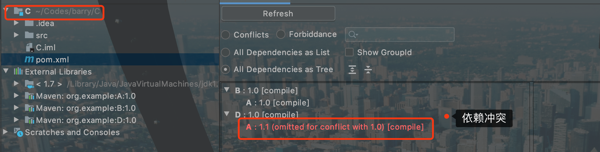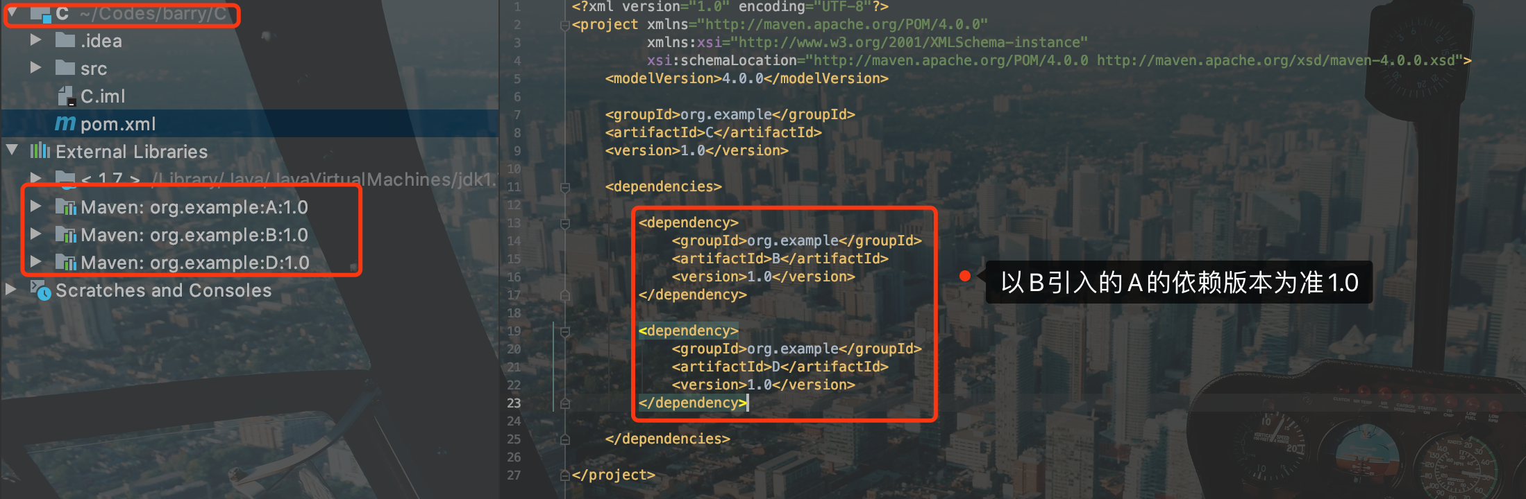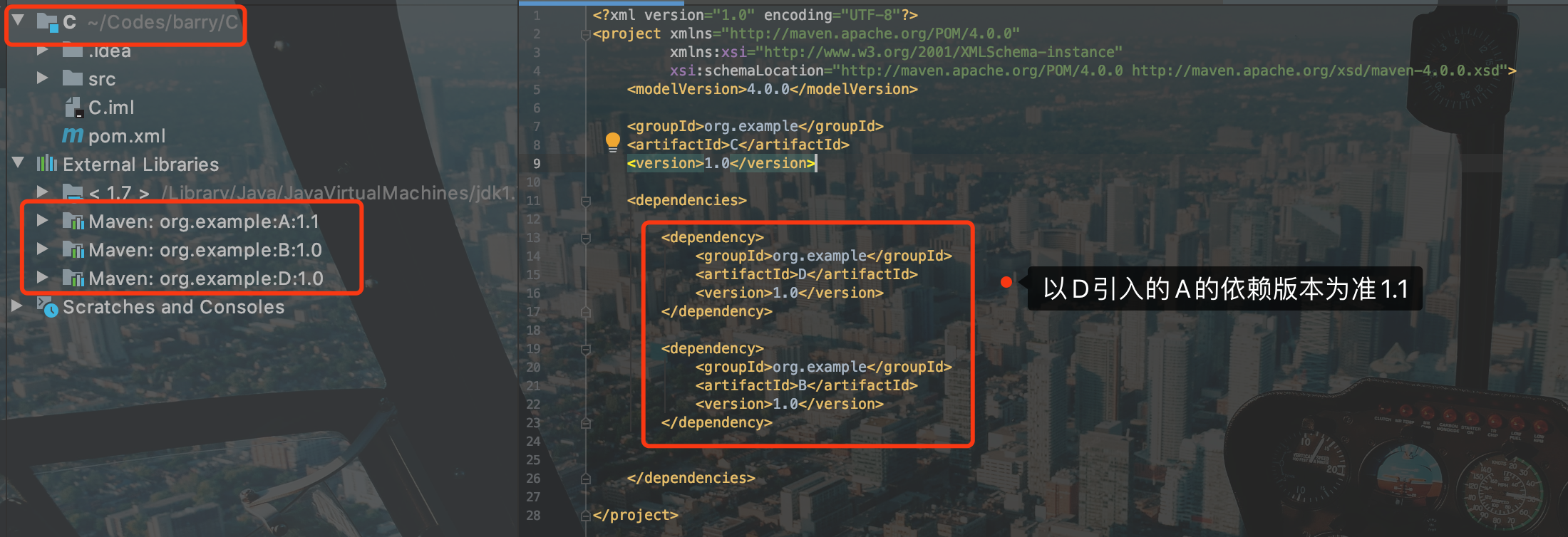 4.5 C工程pom 先引入D 1.0 再引入 B 1.0依赖
