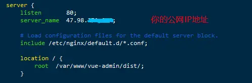 server_name就是你的IP地址,也可以写你的域名,不过你要有域名相关的配置和解析,这里我们就暂时不管它。然后我们看到location这里,就是写你的项目放到的地方,我就是放到了var/www/vue-admin下面。修改完了之后我们退出并保存。重启一下nginx服务器,不然可能配置不生效: