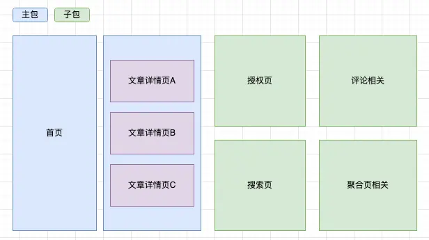 如果单纯根据功能进行分包,那么就会变为主包首页及首页的相关二级页面、分包聚合页、分包多种详情页、分包评论页。