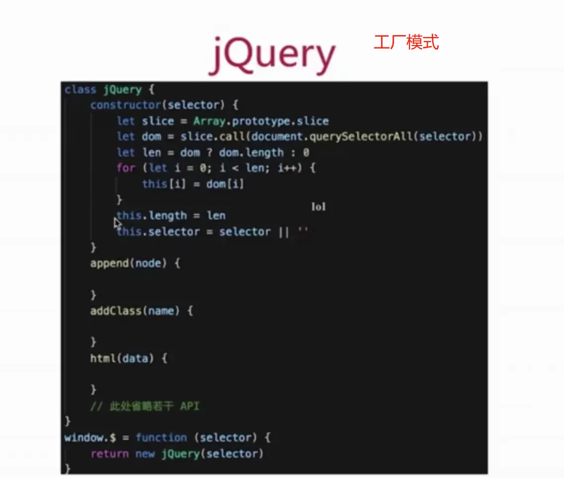 //产品class Product{constructor(name){this.name = name}init(name){console.log('init'+name)}fn1(){console.log('fn1')}fn2(){console.log('fn2')}}//工厂class Creator{create(name){return new Product(name)}}var creator = new Creator()var product = creator.create('pppp')product.init()//可以这样封装Window.creatorCreate = function(name){return new Creator(name)}//外部使用就Window.creatorCreate().create("ha").fn1()//其实就是省去new这个操作//如:$('div')就是工厂模式,如果不是的话就是 new $('div')
