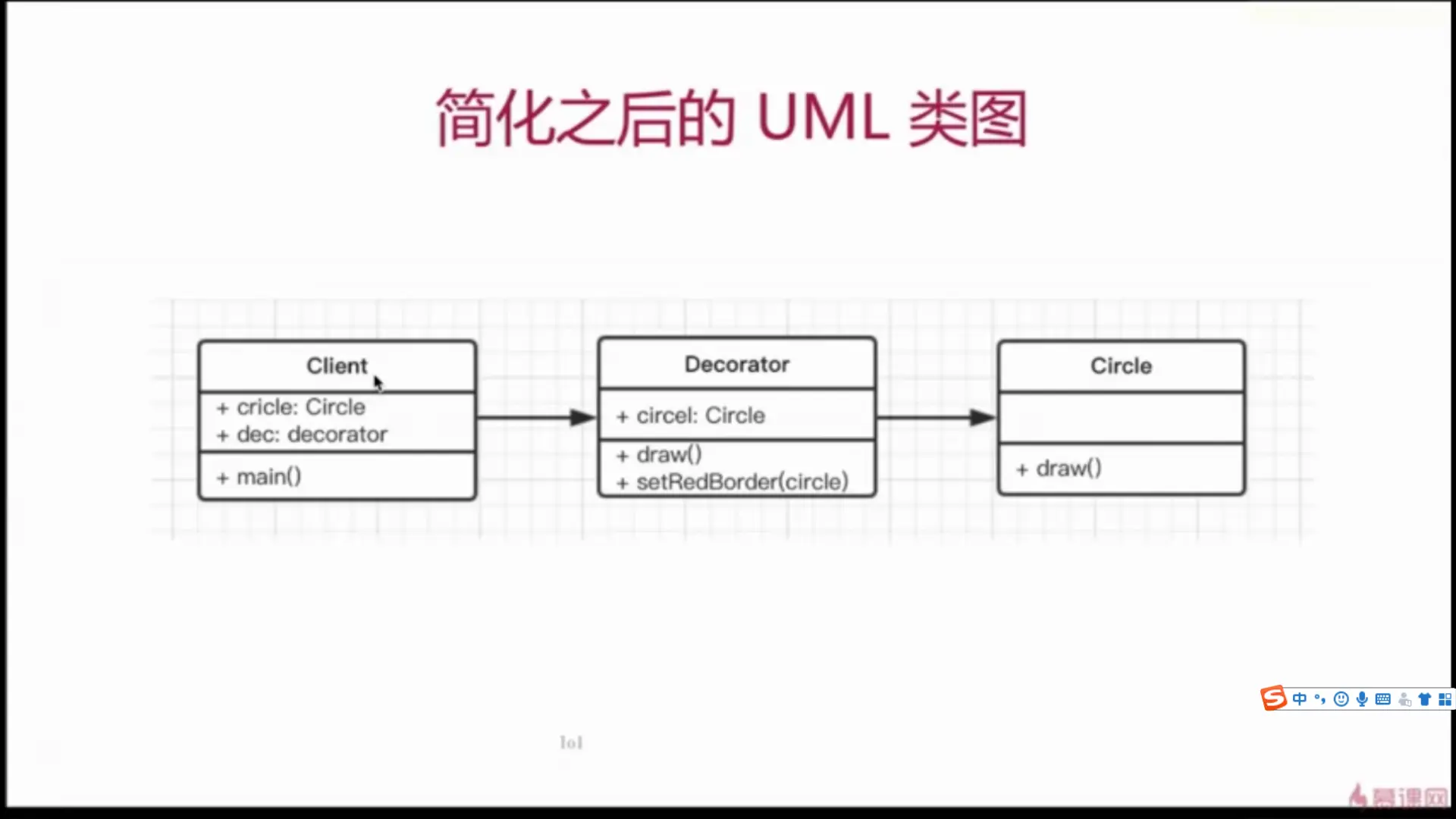 class Circle{draw(){console.log('画一个圆')}}class Decorator{constructor(circle){this.circle = circle}draw(){this.circle.draw()this.setRedBorder(circle)}setRedBorder(circle){console.log('设置红色边款')}}//测试var circle = new Circle()circle.draw()console.log('----')var dec = new Decorator(circle)dec.draw() // 还是原有的方法,但是多了个setRedBorder方法