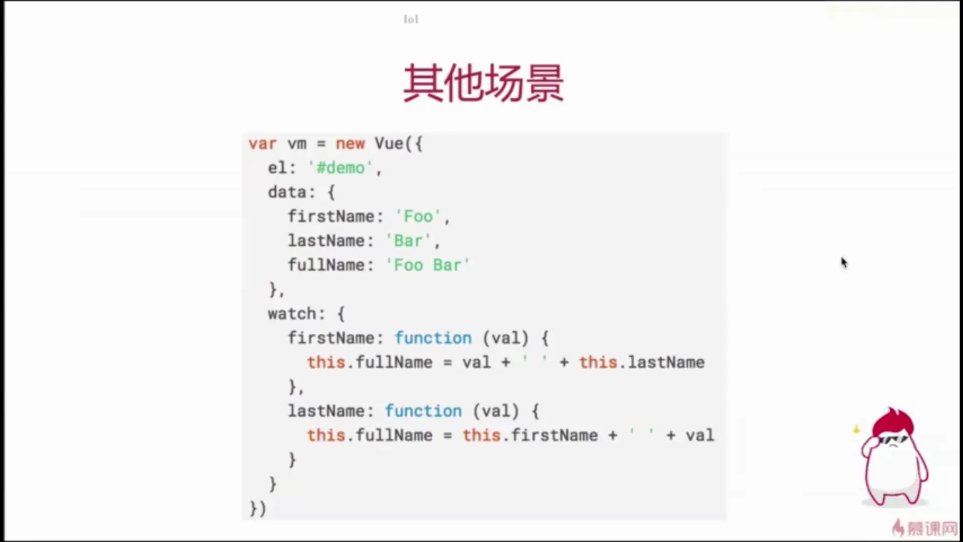 <div id="app"><p>顺序:{{message}}</p><p>逆序:{{reveredMessage}}</p></div><script src="https://cdn.bootcss.com/vue/2.6.11/vue.js"></script><script>var vm = new Vue({el:"#app",data:{message:'hello'},computed:{reveredMessage:function(){//相当于适配器,拿到以前的message,然后转换使用return this.message.split("").reverse().join("")}}})</script>