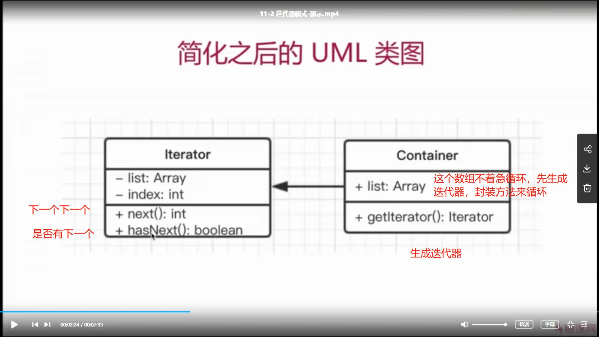 class Iterator{constructor(container){this.list = container.list;this.index = 0;}next(){if(this.hasNex()){ //如果有下一个就循环返回listreturn this.list[this.index++]}return null; //如果没用下一项就返回null}//是否有下一项hasNex(){if(this.index == this.list.length){return false;}return true;}}class Container{constructor(list){this.list = list;}//生成迭代器getIterator(){return new Iterator(this);}}let arr = [1,2,3,4]let constainer = new Container(arr)let iterator = constainer.getIterator()while(iterator.hasNex()){console.log(iterator.next())}//现在不仅仅是可以传数组,因为我们进行封装// 兼容所有的有序集合