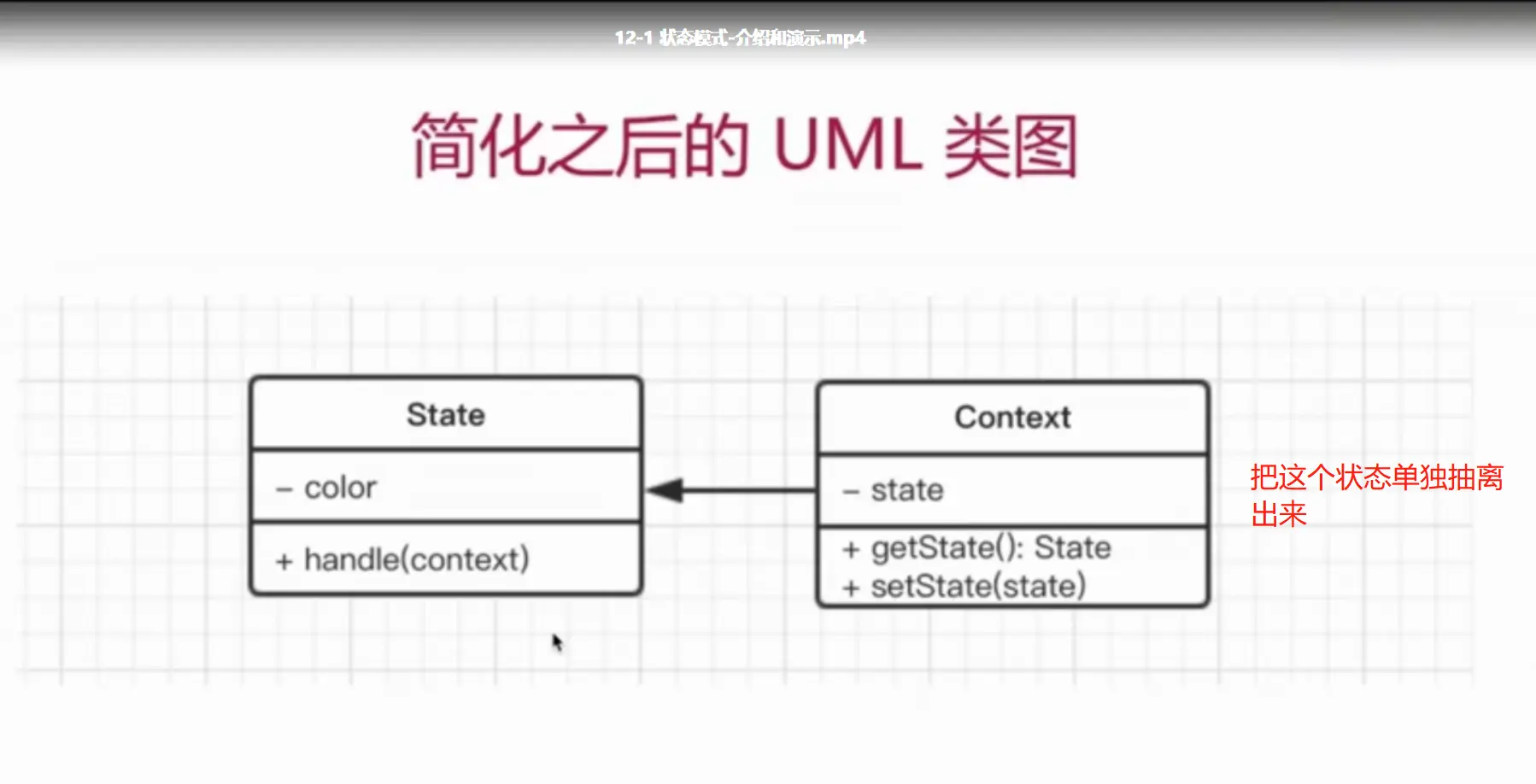 // 状态(红灯、绿灯)class State{constructor(color){this.color = color;}handle(context){console.log(`${this.color}`)context.setState(this)}}//主体class Context{constructor(){this.state = null;}//状态获取getState(){return this.state}setState(state){this.state = state;}}//把主体和状态分离开// 主体可以get set状态,状态变化的逻辑让状态去写//测试let context = new Context()let green = new State('green')let red = new State('red')let yellow = new State('yellow')//绿灯亮了green.handle(context)console.log(context.getState()) //打印状态//红灯亮了red.handle(context)console.log(context.getState()) //打印状态