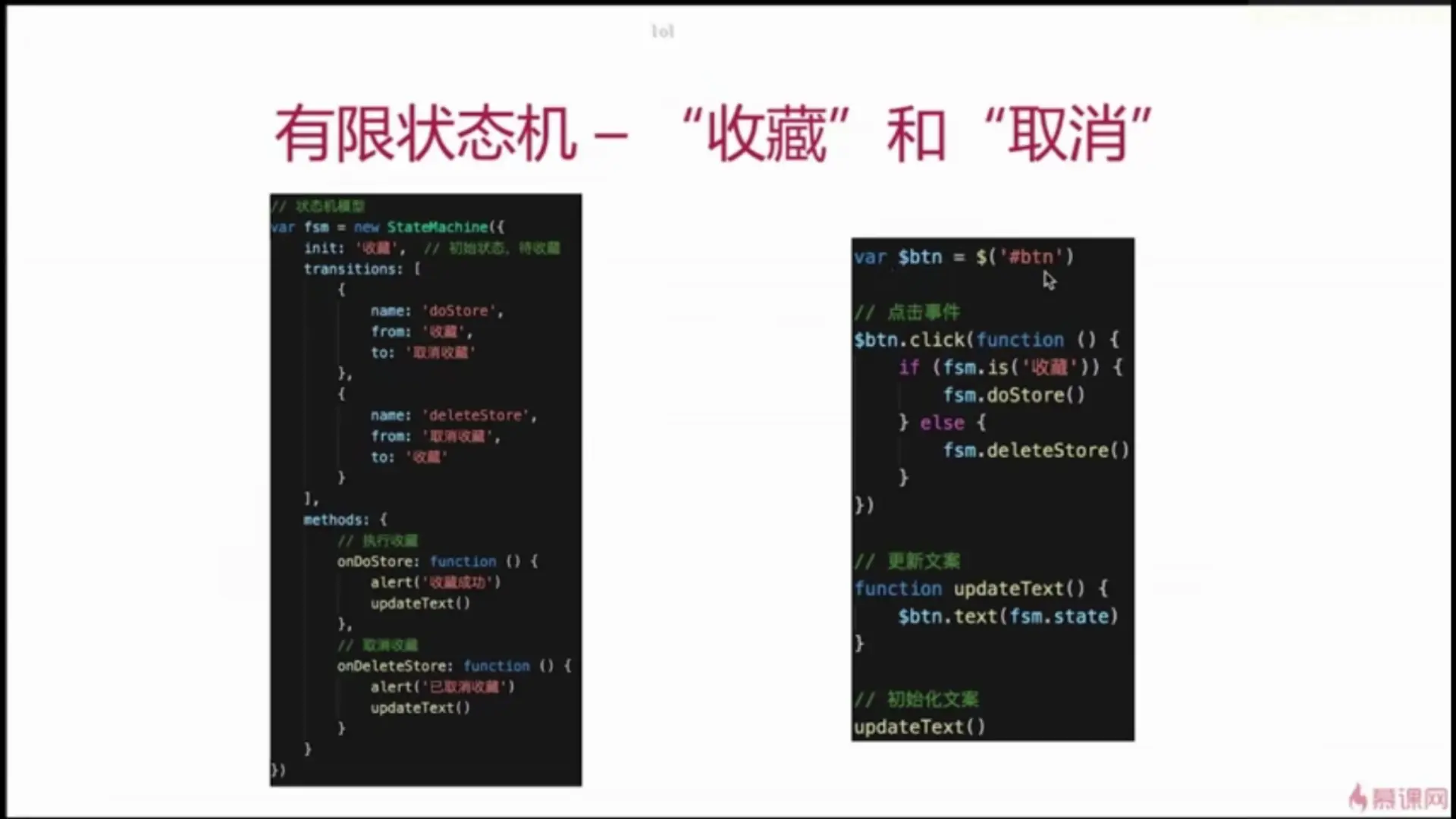 //有限状态机import StateMachine from 'javascript-state-machine'import $ from 'jquery'//像取消关注’取消点赞这些都可以用这个//初始化状态机模型let fsm = new StateMachine({init:'收藏',transitions:[ //不要写欠个s{name:'doStore', //name的方法和methods的onDoStore名字一样,on加name,不过是驼峰命名from:'收藏',to:'取消收藏'},{name:'deleteStore',from:'取消收藏',to:'收藏'}],methods:{//监听执行收藏onDoStore:function (){ //方法名字和transition的name一样,on加name,不过是驼峰命名alert('收藏成功'); //可以post请求,数据库更新updateText()},onDeleteStore:function (){alert('取消收藏成功'); //可以post请求,数据库更新updateText()}}})let btn = $('#btn1')btn.click(function(){if(fsm.is('收藏')){fsm.doStore()}else{fsm.deleteStore()}})//更新按钮文案function updateText(){btn.text(fsm.state)}//初始化文案updateText()