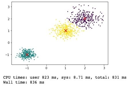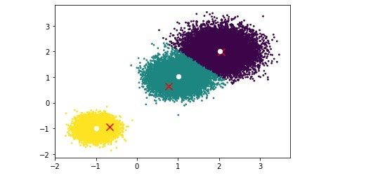 上图当中白色的点表示最后收敛的位置,红色的X表示我们用Kmeans++计算得到的起始位置,可以发现距离最终的结果已经非常接近了。显然,我们只需要很少几次迭代就可以达到收敛状态。