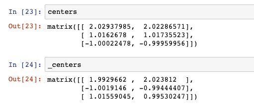 我们再来看下两次聚类的中心,从图片上来看两者误差极小,我们打印出坐标来观察,误差在0.05以内,可以说是非常接近了。