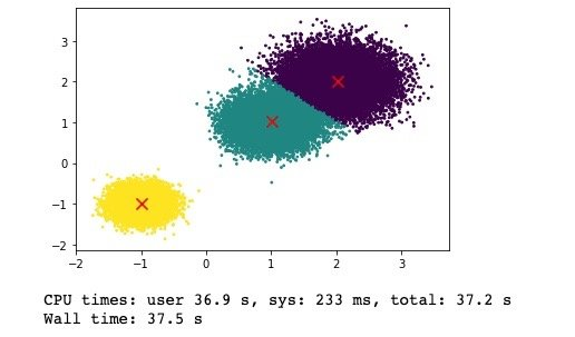 我们利用上周开发的并没有经过任何优化的代码,并且将生成的样本的数量增加到五万,从下面的这张图我们可以看出,朴素的Kmeans足足用了37.2秒才完成了计算。我们得到的聚类结果如下: