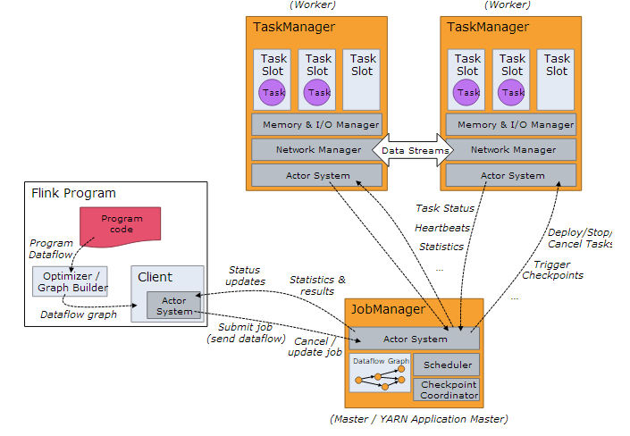 - Flink 运行在由一个 master 节点、一个或多个 worker 节点组成的集群上。
