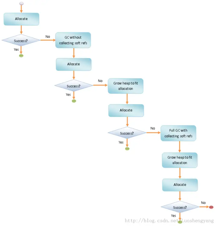通过这个流程可以看到,在对象的分配中会导致GC,第一次分配对象失败我们会触发GC但是不回收Soft的引用,如果再次分配还是失败我们就会将Soft的内存也给回收,前者触发的GC是GC_FOR_MALLOC类型的GC,后者是GC_BEFORE_OOM类型的GC。而当内存分配成功后,我们会判断当前的内存占用是否是达到了GC_CONCURRENT的阀值,如果达到了那么又会触发GC_CONCURRENT。