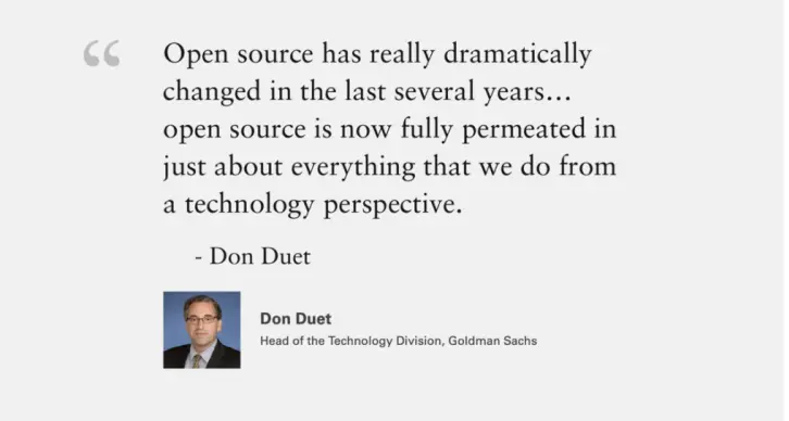 不夸张的说,开源软件改变世界– 不管在一个App里面还是在一套交易系统中,都“借力”着不计其数的开源代码库、开源工具。现在谁敢说自己的软件是一行一行代码从零开始构建?正如高盛的技术负责人Don Duet所说,从技术角度看“开源渗透到我们所做的一切事情中”。