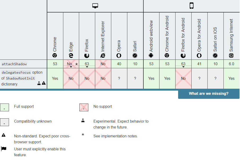 笔者测试Element.attachShadow(shadowRootInit)在现代浏览器的兼容性更强 并且Element.createShadowRoot()不是W3C标准,MDN并不建议使用 于是以下均用Element.attachShadow(shadowRootInit)来举例子 对Element.createShadowRoot()有兴趣的可以跳转简书帖子阅读