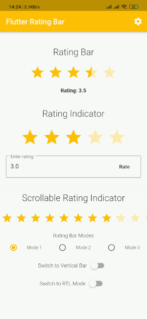 A simple ratingbar for flutter which also include a rating bar indicator, supporting any fraction of rating.