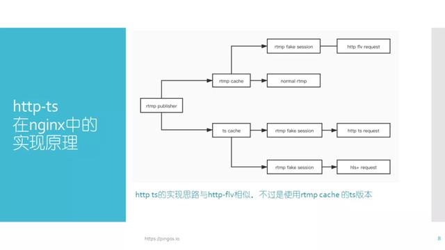 图中展示的是http-ts在Nginx中的实现。其实现思想与http-flv的实现基本一致,仅仅是在操作上有所不同,不同点在于http-ts需要一个独立的buffer进行缓存。由于http-ts与http-flv的数据格式相差较大,对于flv数据到rtmp来说,只需要将数据拆成一个个小块,并在前面添加一个header。即使flv数据的最一帧或者一个分块缺少也不用补齐。