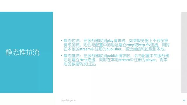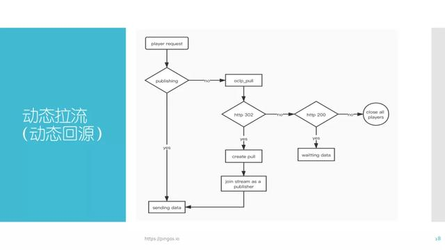 推流过程也存在类似操作,推流中存在publish,同样分为三个阶段,play和publish主要应用在鉴权操作中。如果在start阶段,业务服务器返回了一个404或者非200的结果,服务器就会中断当前的play请求,publish亦是如此。除此之外, pull与push主要应用于动态拉流阶段。当服务器接收到play请求,并且发现当前服务器里面没有目标流,也就是说publish的流不存在,就会触发pull的start阶段。在发送start请求之后如果业务服务器返回结果为302,并且在location中又写了一个新的rtmp地址或http-flv地址,这台服务器就会向标记的那一台目标服务器拉取rtmp流或fIv流,这个过程就被称为动态拉流。