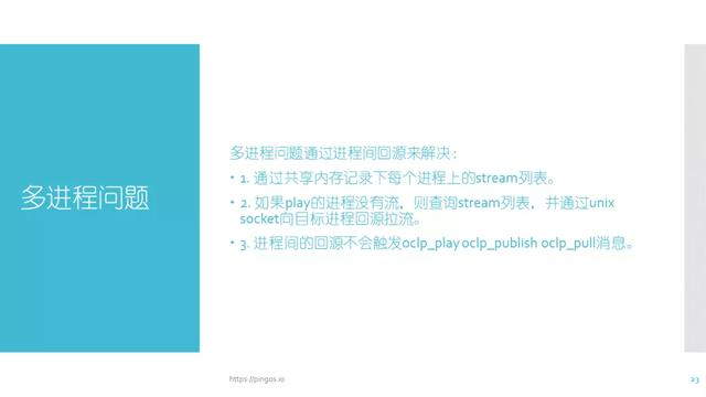 多进程问题在原生的nginx rtmp中有很多bug,现在的做法是通过共享内存记录下每个进程上的stream列表。如果play的进程没有流,则查询stream列表,并通过unix socket向目标进程回源拉流。除此之外,进程间的回源不会触发ocl_playoclp_publish oclp_pull消息。