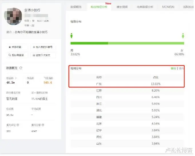 图中可以看出女性粉丝占6.5成,在广东的人最多。