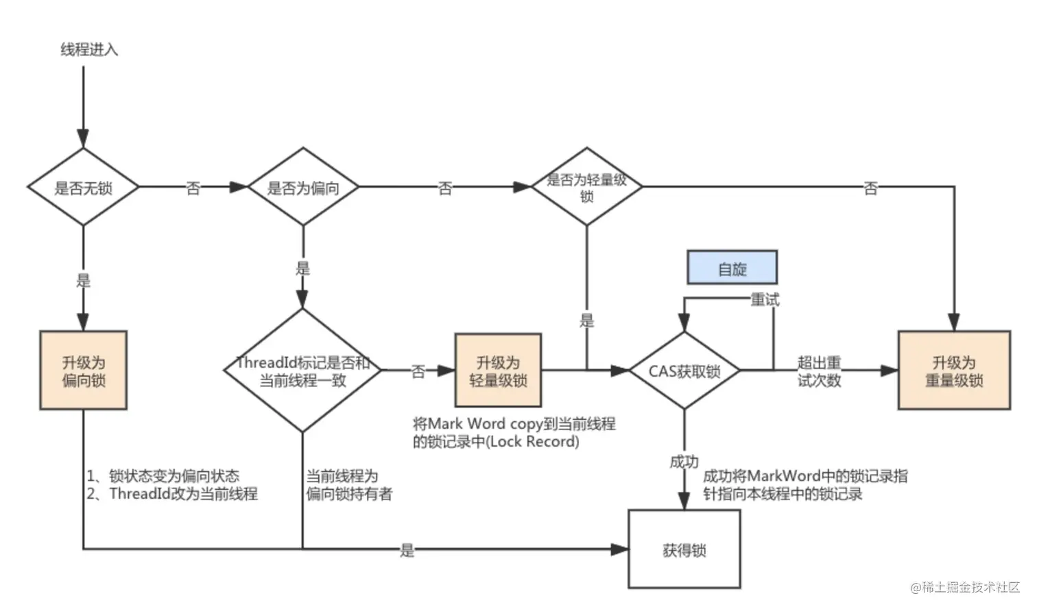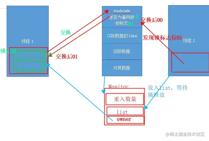 每个对象都会与一个monitor相关联,当某个monitor被拥有之后就会被锁住,当线程执行到monitorenter指令时,就会去尝试获得对应的monitor。步骤如下:
