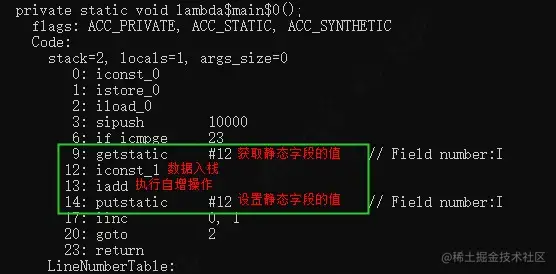 每个线程执行的逻辑是循环1万次,每次加1,那我们希望的结果是2万,但是实际上结果是不足2万的。我们先用javap命令反汇编,我们看到很多代码,但是number++涉及的指令有四句,具体看第二张图。