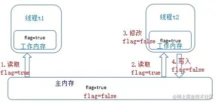 下图线程t1,t2从主内存分别获取flag=true,t1空循环,直到flag为false的时候退出循环。t2拿到flag的值,将其改为false,并写入到主内存。此时主内存和线程t2的工作内存中flag均为false,但是线程t1工作内存中的flag还是true,所以一直退不了循环,程序将一直执行。