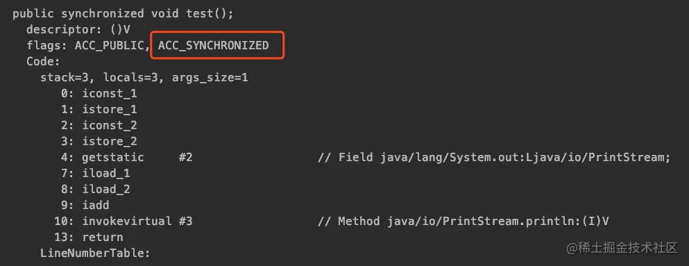 我们看到最终number为20000,那为什么要加上synchronized,结果就正确了?我们再反编译下Example2,可以看到在四行指令前后分别有monitorenter和monitorexist,线程1在执行中间指令时,其他线程不可以进入monitorenter,需要等线程1执行完monitorexist,其他进程才能继续monitorenter,进行自增操作。
