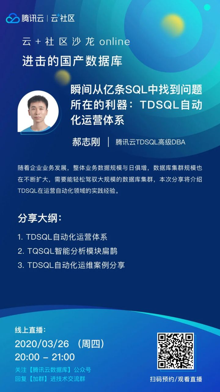 直播预告 | 瞬间从亿条SQL中找到问题所在的利器:TDSQL自动化运营体系 腾讯云数据库 2020-03-25 190 阅读1分钟 直播互动福利:每晚直播间也同样会送出多份腾讯公仔,更有腾讯徽章、腾讯云代金券等好礼送上!快快预约报名吧!扫码关注后回复「加群」提前加入沙龙交流群