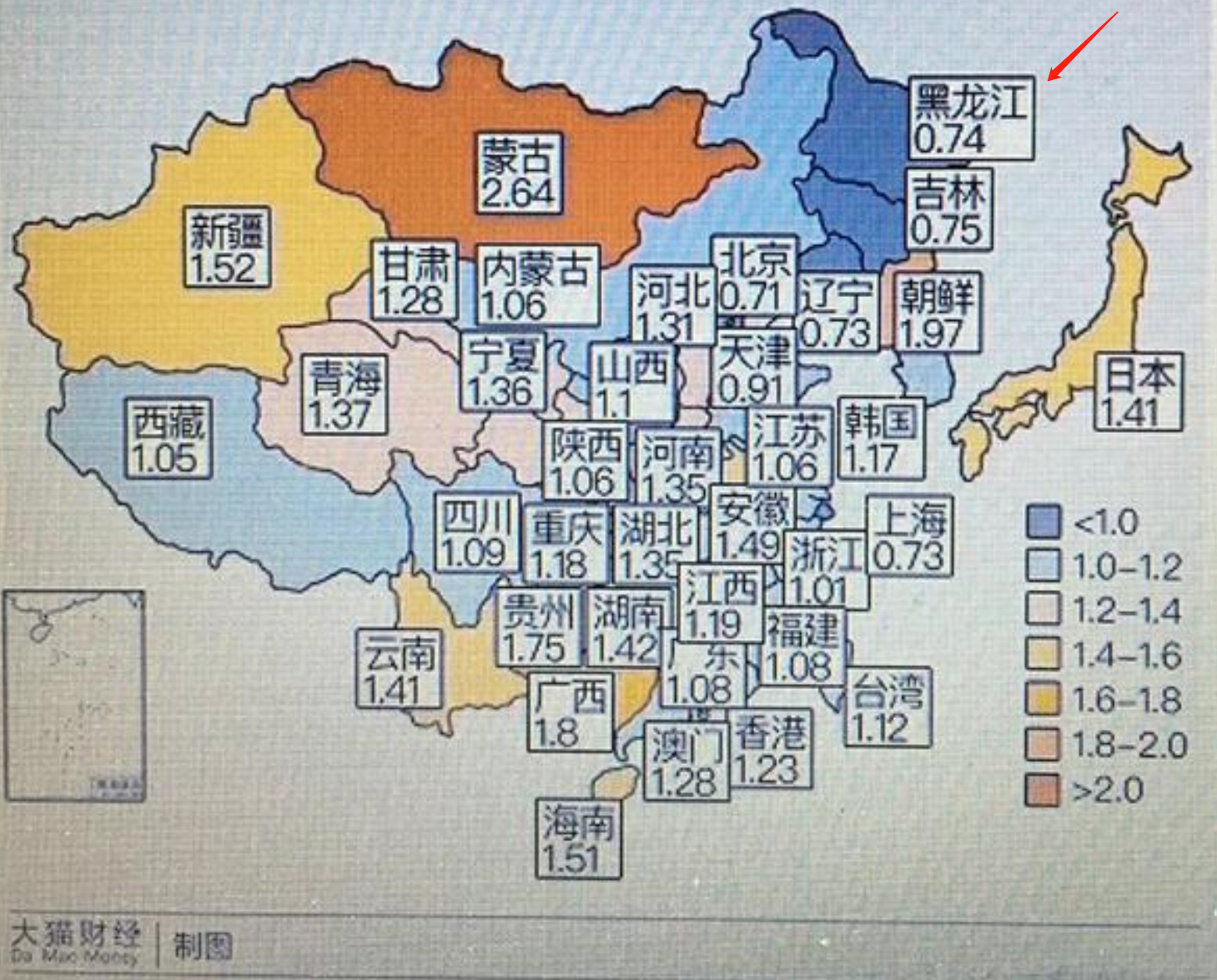 0.7有多低?中国的平均生育率是1.18,最高的地区是蒙古的2.64,而鹤岗所在的黑龙江省只有0.74,全国倒数第三,鹤岗比黑龙江省的平均生育率还低。