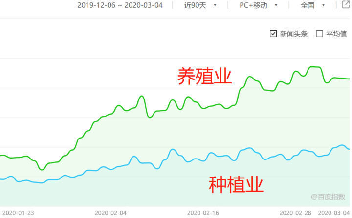 在农业这个大类之下,养殖业和种植业的百度指数上升明显,养殖业比疫前上升了38%,种植业上升了17%。