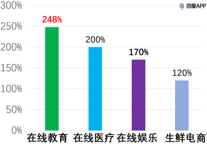 从百度搜索指数得知,大部分线上业务在疫期增长迅速,除了上文提到的在线办公,像在线教育、在线医疗、在线娱乐和生鲜电商,其百度指数近1个月都增长了100%以上。