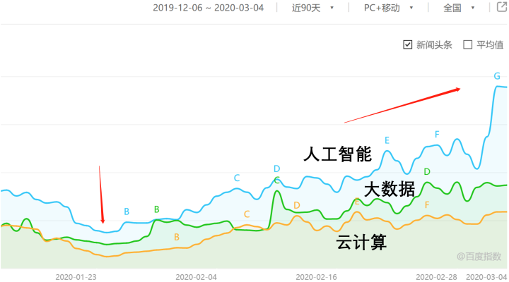 其中人工智能的百度指数上升最明显,大概比疫情发生之前上升了30%,查了一下,原来是得益于3月3日《人工智能专业研究生将扩招》的这条政策。