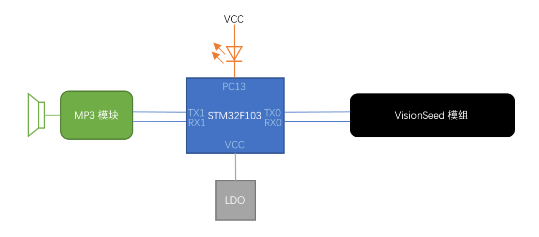 我们选择STM32F103来运行报警逻辑,通过串口0连接VisionSeed,串口1用来控制MP3模块发出报警声,PC13连接一个状态指示灯,原理图很简单: