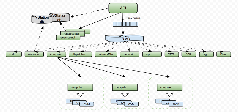 前面提到,资源创建需要与诸如用户控制数据,网络服务,存储服务,镜像服务,密钥,安全组服务等进行交互,完成用户与用户所创建的虚拟机资源的映射。VStation平台设计之初就考虑到针对高并发,批量创建的场景,对周边系统的交互实现了并行化通信。同时,为支持高并发,提高服务的吞吐量,每种与其他服务交互的工作进程通过高可用消息队列通信,都是无状态和可扩容的。真正实现高可用,高并发,自动容灾。以下是VStation 内部系统的核心架构。