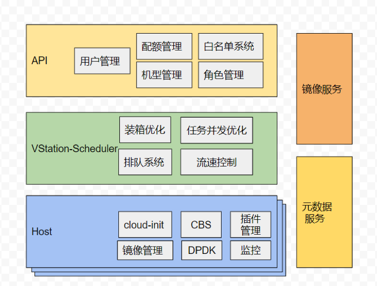 首先上一张腾讯云操作系统VStation框架图,腾讯云操作系统VStation承担资源调度、请求排队,已经对大批量,高并发创建请求做了充分的优化。具体来说: