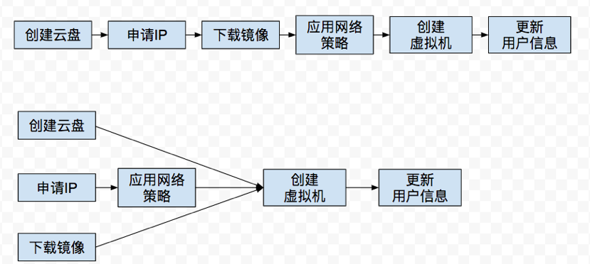 由于一个完整的创建任务涉及到的各种子任务较多,单纯串行执行虽然逻辑清楚且维护简单,但不利于充分发挥系统能力,高并发创建场景中耗时较长。我们通过分析虚拟机实例创建过程中的各种依赖关系,将不耦合的任务并行执行,把简单的单项图转换成有向无环图(DAG),进一步提升任务的并行度。