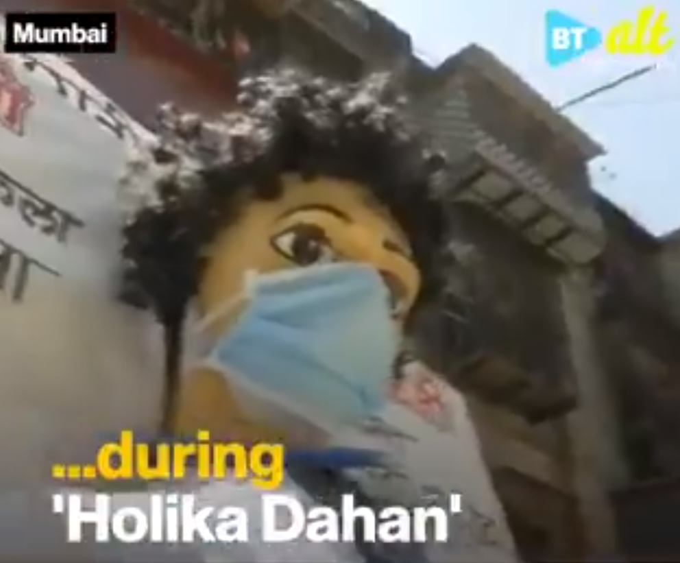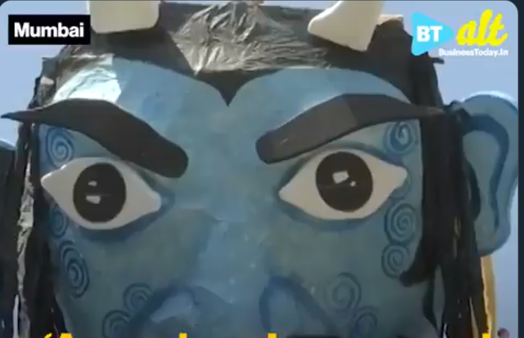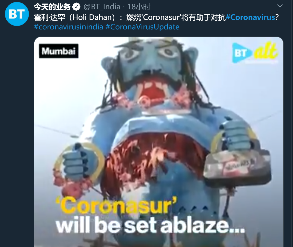 印度各地争相制作这种巨大的纸人偶,大概有15米高,称为“病毒恶魔”,然后烧掉,声称这样可以驱赶病毒。