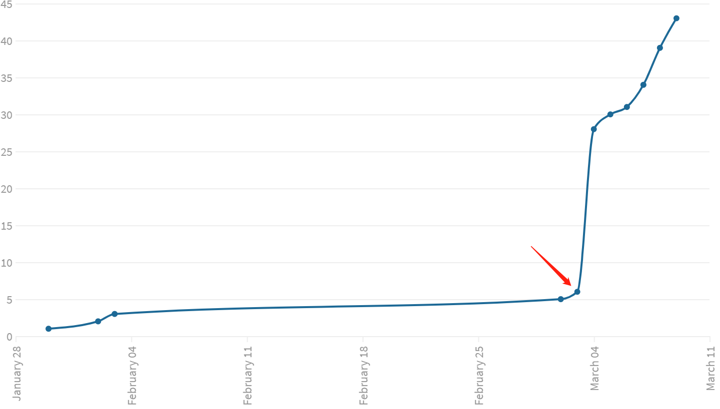 可以看到印度的确诊人数增长曲线非常陡峭,最陡峭的地方是3月3日的6人飙升到3月4日的28人(箭头处)。