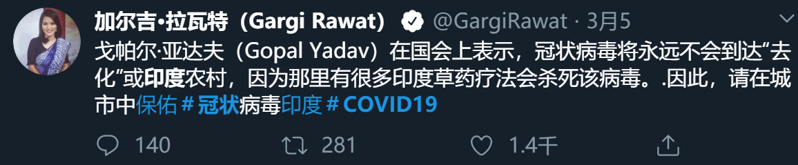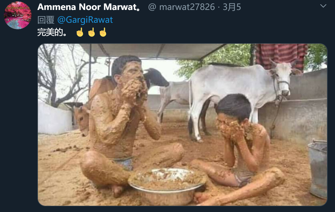 在推特上搜索 india coronavirus,你会打开魔幻世界的大门,这里有人宣称牛尿和粪便可以治疗病毒