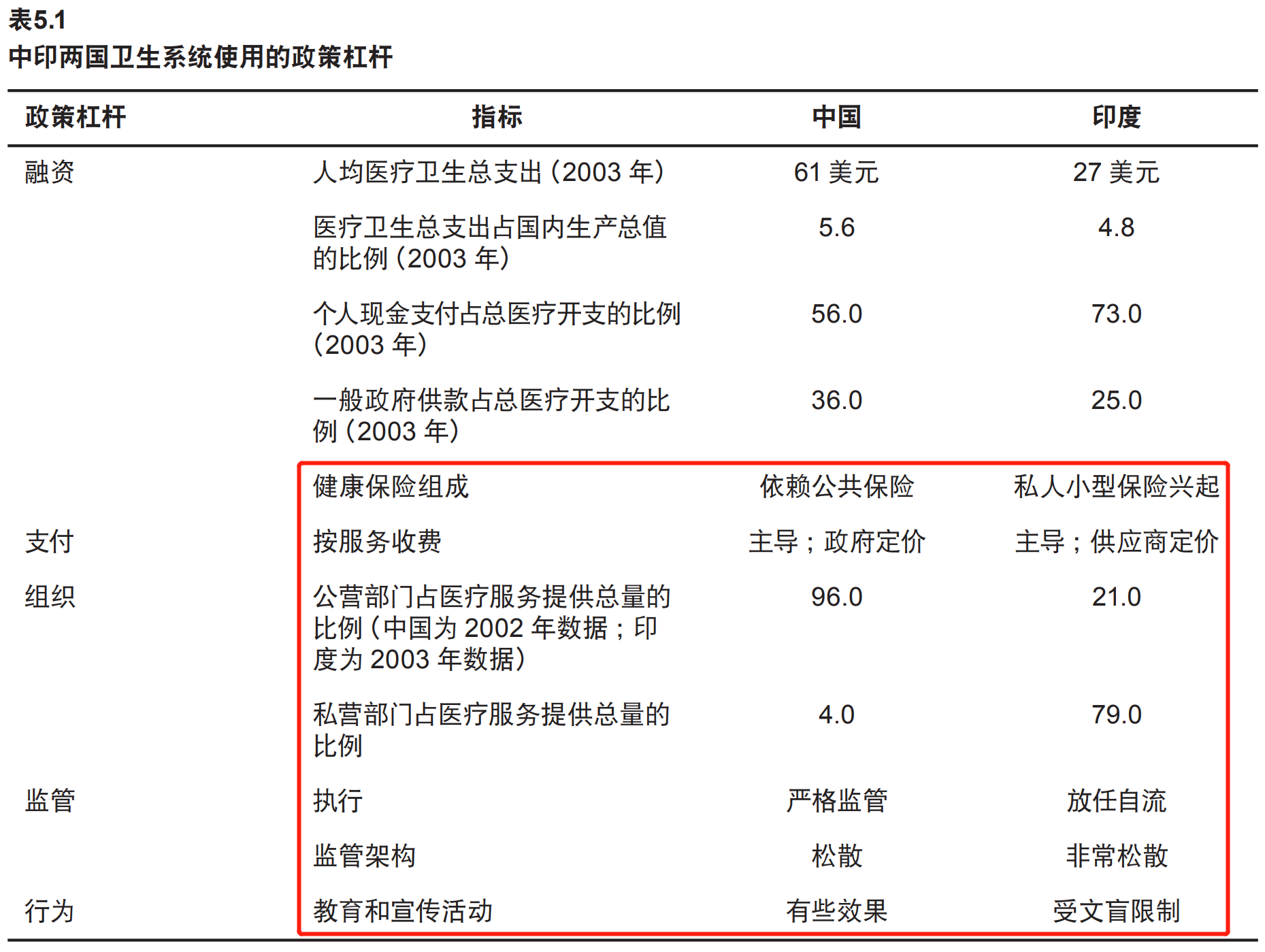 表格总结了印度和中国两国医疗系统的明显不同,中国是严格监督,印度是放任自流,印度的公立医院很少,仅占比21%,中国是96%,中国的医疗保险主要是国家的医保,而印度主要靠私人保险公司,由此导致两国个人医疗支出比例的不同,中国个人支出仅占56%,而印度是73%。