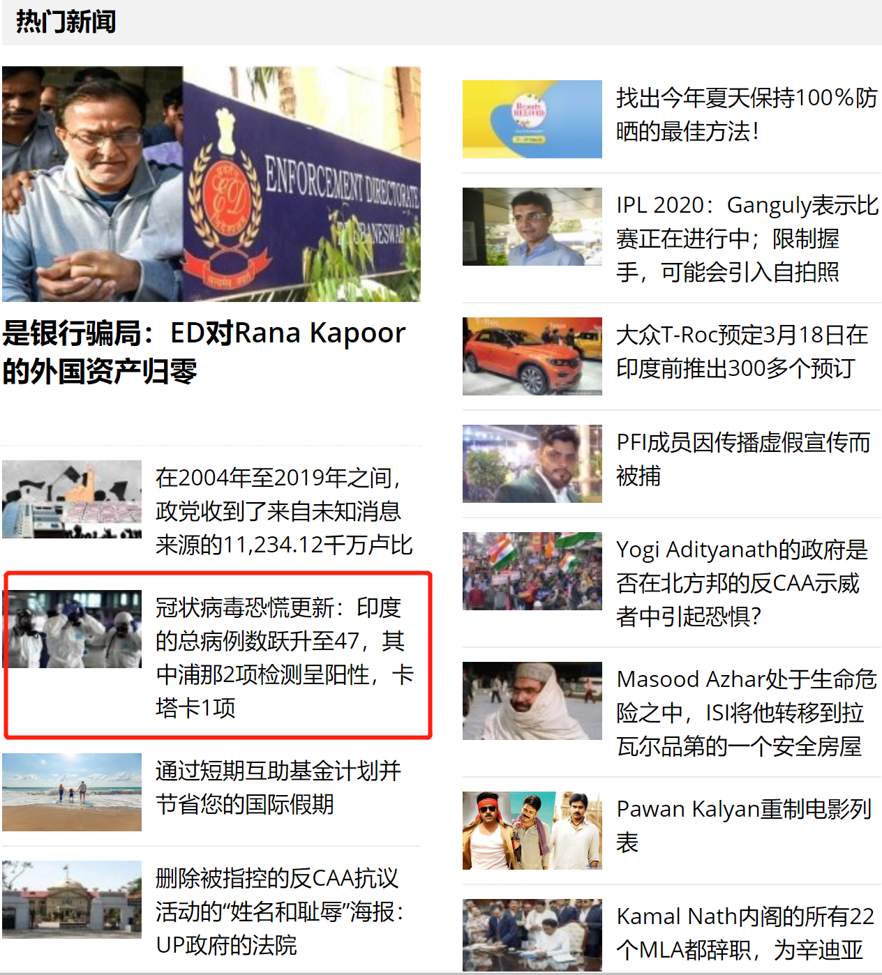 印度当地门户网站oneindia上的热门新闻,仅有1条跟冠状病毒相关。