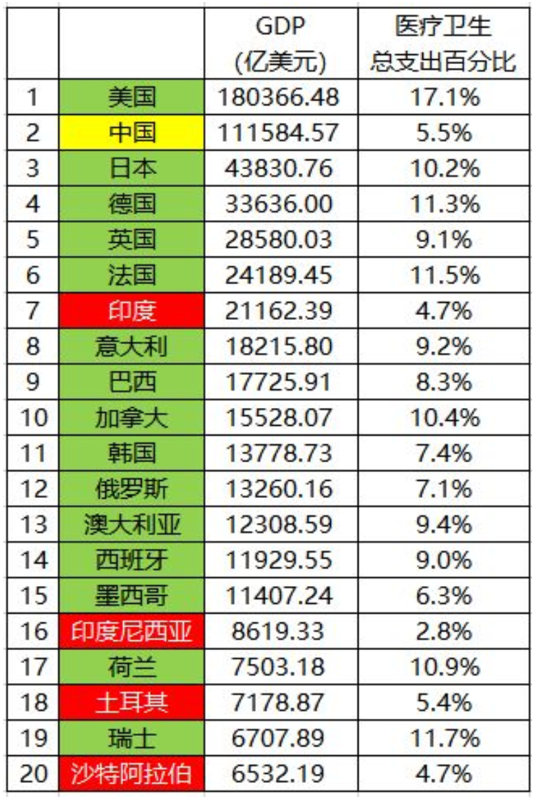 我好奇又去查了一下全球GDP前20国家的医疗支出占GDP的比例,发现中国跟发达国家相比还是有很长距离,印度是倒数第二,倒数第一是印度尼西亚。