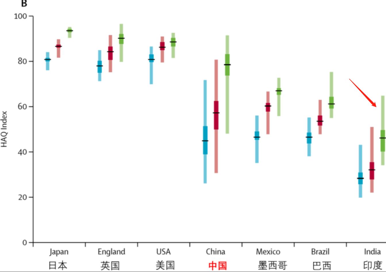 解释一下这个图,横轴代表国家,竖轴代表医疗水平得分,柱形图的意思是每个国家不同地区的得分跨度,比如中国的西藏是40分,北京是90分,连起来就是一个柱形图,柱形图越长代表医疗水平分布越不均匀。