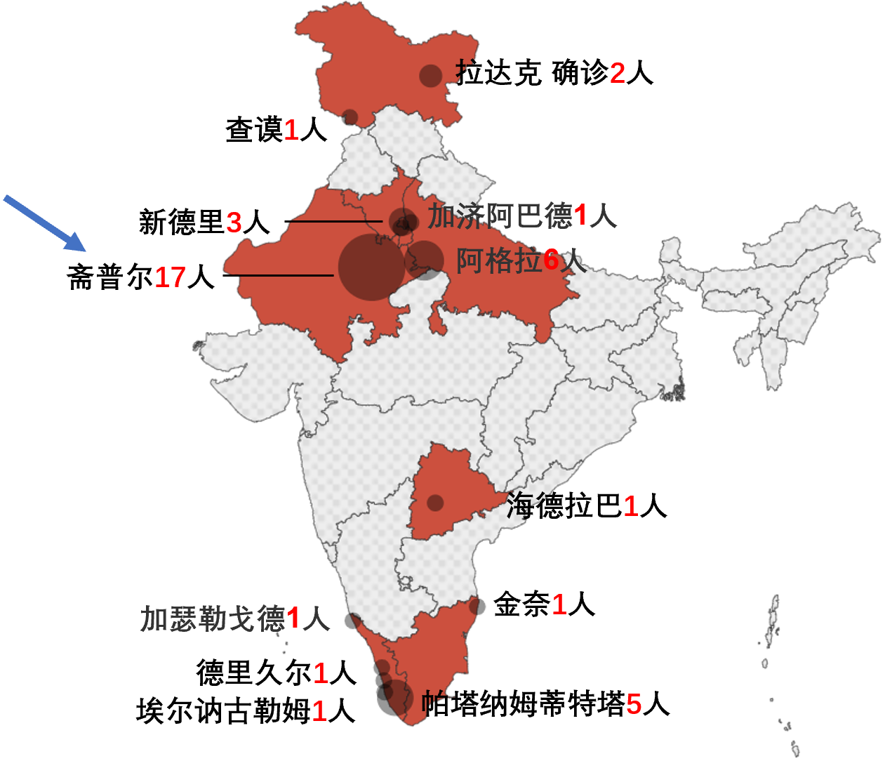 文章介绍了印度各个州各个城市的确诊人数,其中斋普尔感染人数最多,达到17人,斋普尔是印度的著名旅游城市,人口仅62万,其他城市都只有个位数的确诊。