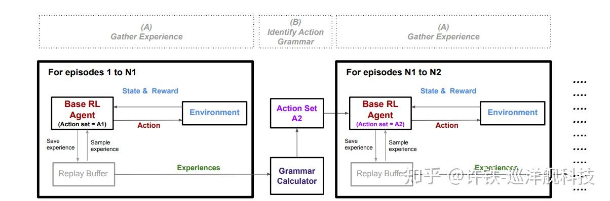 agent需要在探索游戏并记录自己在游戏中的历史,与一般的强化学习流程不同,这里的一些经历是没有加入噪声的,这些经历被单独放入到一个叫Sequitur的程序里进行action的语法生成, 在这个过程里, 一些经常重复的行为片段比如ababab,会被替代为ccc , c =ab, 这个新生成的c, 被称为marco-action,生成符号的标准是新符号可以减少描述整个序列需要的字符数(符号的本质?)如此我们进行一级级的迭代,就得到action的整个语法树,这里的方法像不像是刚刚讲过的从序列中生成代数结构和树结构的方法?