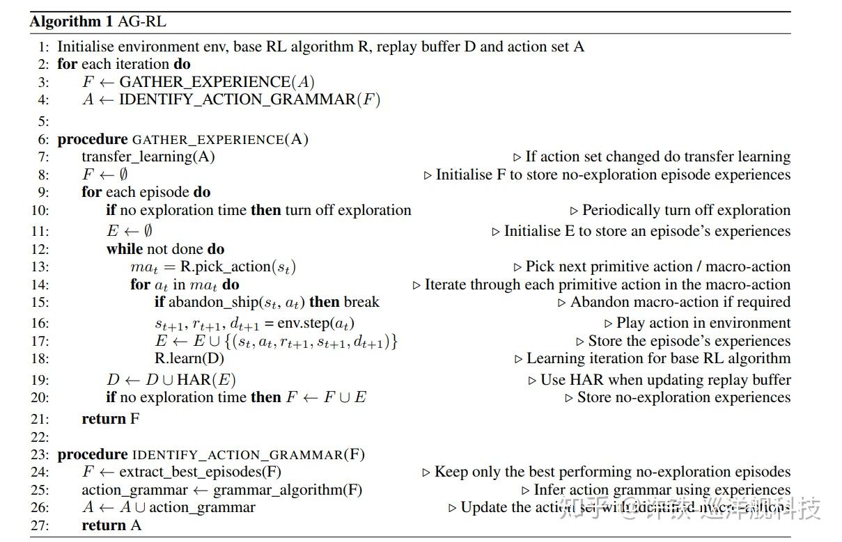 这篇文章的核心思想是, 如果把动作看做一组时间序列,我们可以对动作的集合本身建立一套语法规则, 得到一组macro-action,也就是由若干动作组成的动作的宏,它们可以作为新的基本单位被学习。这样,我们变可以把动作 打包来学习。这样一个个基本动作就可以构造出一个层级嵌套的结构 ,大大减少需要学习的动作组合数。这种方法在20个atari game里19取得了 性能的进步。