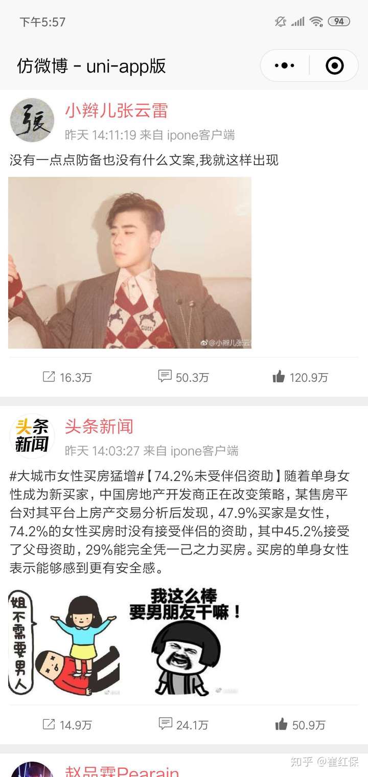 - 开发内容:开发一个仿微博小程序首页的复杂长列表,支持下拉刷新、上拉翻页、点赞。