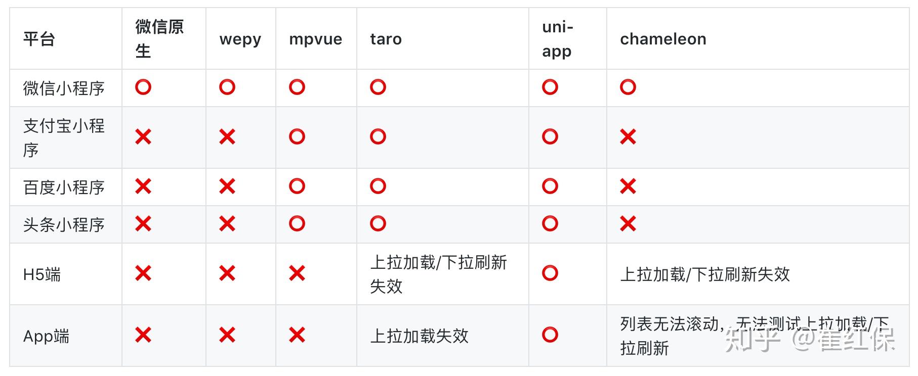 跨端框架,还涉及一个ui框架的跨端问题,评测结果如下: - taro:官方提供了taro ui,支持小程序(微信/支付宝/百度)、H5平台,不支持App,详见 - uni-app:官方提供了uni ui,可全端运行;uni-app还有一个插件市场,里面有很多三方ui组件,详见 - chameleon:官方提供了cml-ui扩展组件库,可全端运行,但组件数量略少,详见