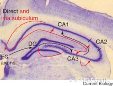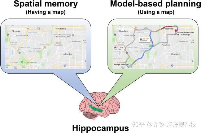 海马体即途中那条蜿蜒如回(形容海马)的部分,在大脑里处在一个非常特殊的部位,从位置上看它是一个枢纽性的节点,和所有其它脑区均有连接, 从形状上它让人想到一个电影胶带,从功能上看它承载了空间表示和情景记忆。 从进化角度, 它是脊椎动物里进化比较保守的脑区, 因为记忆显然是智能最核心的组成部分之一。 模仿这部分脑区来做AI,也就显得很有必要。