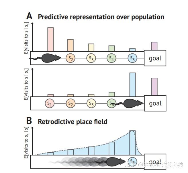 这篇文章拓展了cognitive map的概念, 认为事实上hippocampus表征的不是生物当下的状态, 而是未来一系列变化可能性的总和(体现路径积分的概念)。 predictive map 与强化学习有很深刻的联系, 它强调导航问题必须在强化学习框架下理解, 预测性地图是比认知地图更广阔的概念, 而过去的认知地图变成仅仅是预测地图的一个特殊解。 这个理论框架比之前的专门针对导航任务的认知地图概念提升了一大步, 在这个框架下, 我们不需要用一种缺什么补什么的思维去寻找某个“位置细胞”或者“边角细胞” 。而是从整个网络编码的角度看, 把地图的本质- 一张可以预测未来状态的结构图表抽取出来, 从而提供一个可以供强化学习使用 。