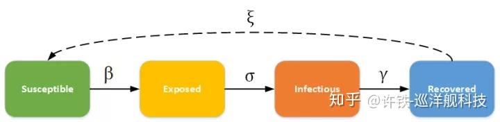 但是显然忽略了众多核心要素, 第一感染后的恢复者是否会在感染, 以及是否当接触发生,同时I就变成了S, 也就是说接触和感染发病几乎是同时的。我们知道潜伏期是存在的, 那么加入潜伏期会对整个病患产生什么样的影响?再者这里我们忽略了网络效应,假定人口是封闭的。对于病毒, 这也不是一个特别合适的买卖, 因为经过一轮传播自己也灭绝了。由此我们需要对整个疾病方程进行修正, 得到通常说的SEIR模型, 也就是在三个变量后加入一个E, exposed 也就是潜伏期的人。