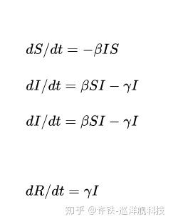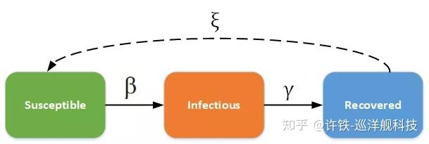 我们把类似的思维用到疾病防控的思维里来, 如果你要做一个模型预测疾病的走势, 就首先要把这个问题简化成一个维度较低的系统, 这里我们可以把人口切分为三分,易感人群, 感染人群和康复人群, 病毒传播过程里感染人群会传播易感人群会, 而某段时间又会恢复。我们把这三个变量相互影响的关系用微分方程刻画,就得到一个简单的动力系统, 这三个变量可以称为S, I 和R。I感染S, 同时I可以恢复成为R。虽然传播是复杂的, 但是抓住最核心的因素, 无非三个不同的人口群体, 易感, 感染和恢复, 好比把人群分成了三节车厢, 这三节车厢就是SIR, 通过分析人口在这三个车厢的迁徙就可以预测未来的患病人数变化(如下图)